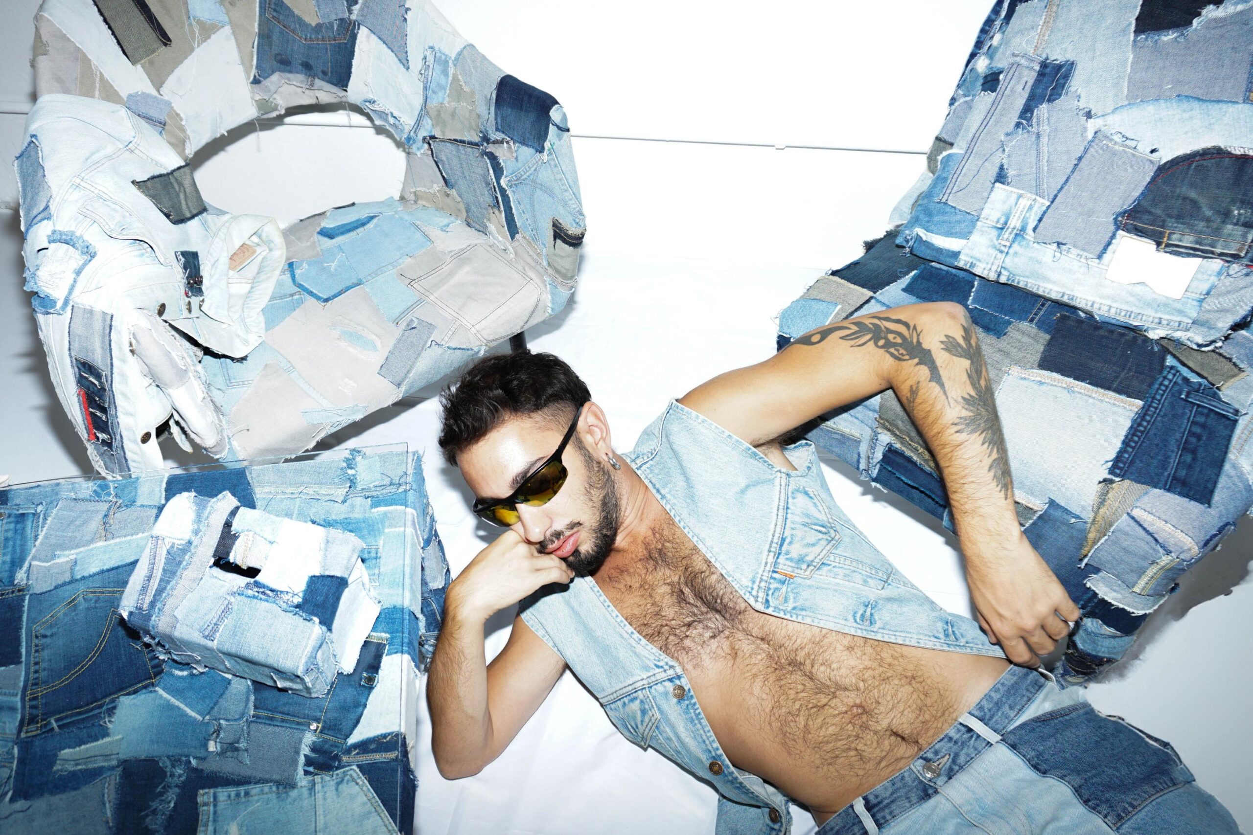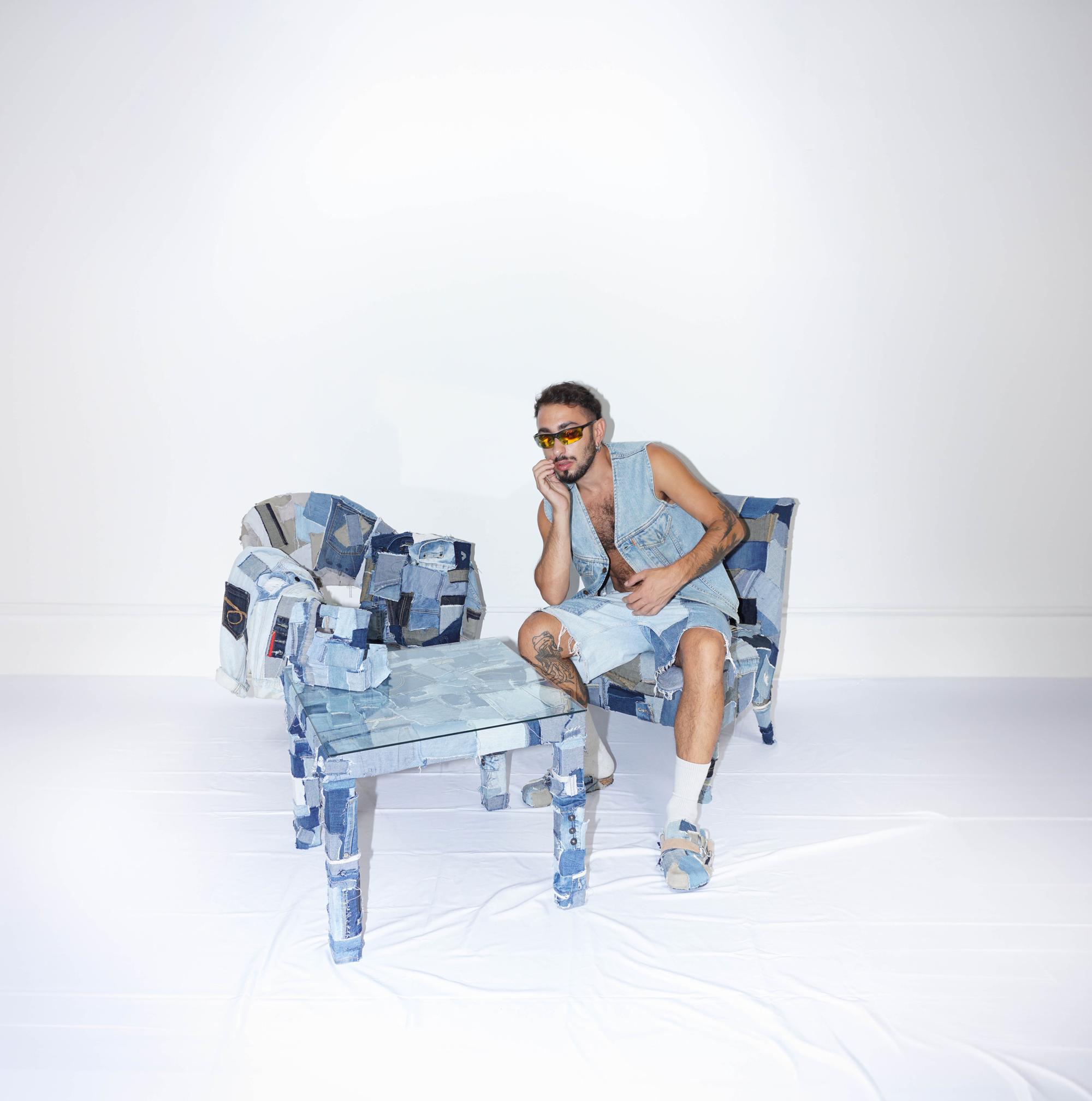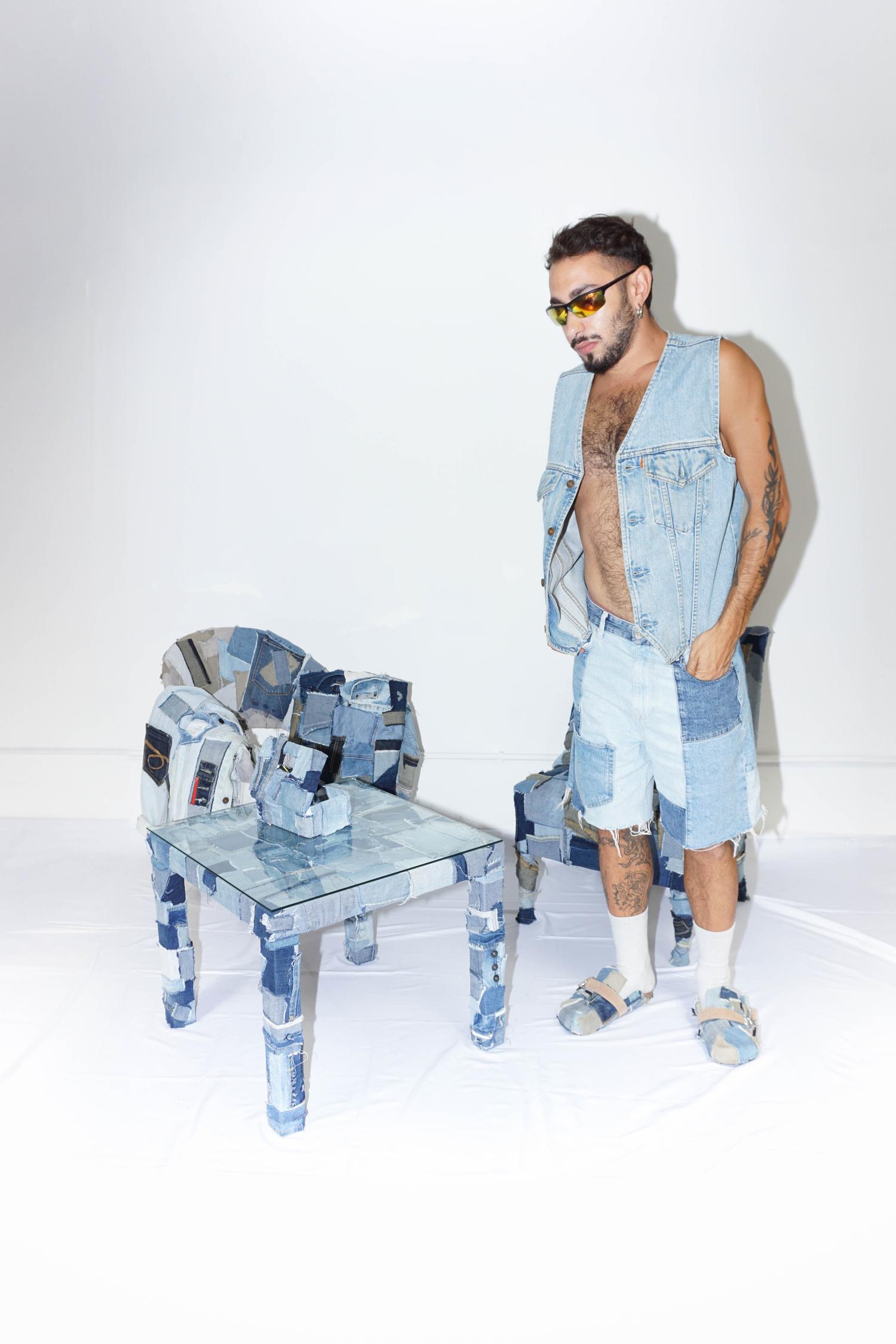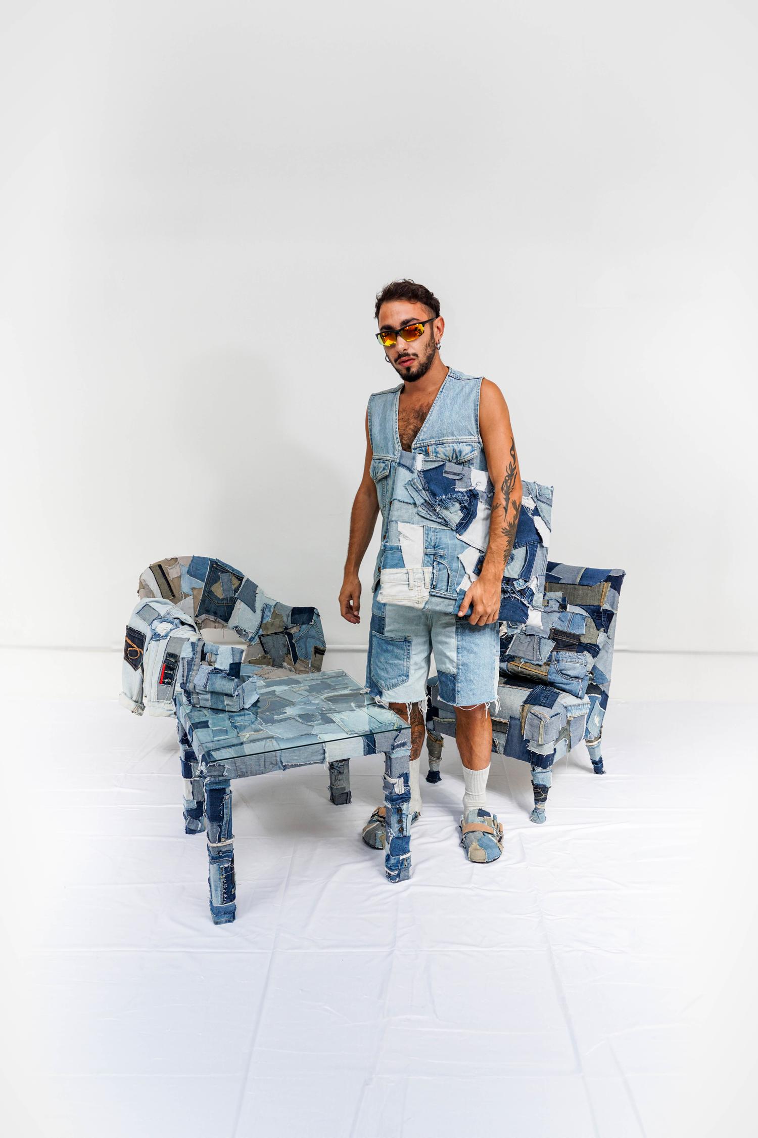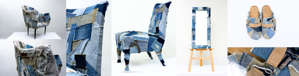 Denim Dream is proposed as a static-interactive installation. Where the viewer can choose to interact with the work or look at its details and the composition created. It is a safe-space, a dimension of rest that is meant to evoke moments of quiet after work and toil, supported again by the same material but with a different form. The works are created by randomly cutting, tearing and gluing material, this is precisely to give the idea of not having a written and defined history but leaving it to chance and creativity to rewrite the history of the object that is given new life. In addition to being able to make visual contact with the works, one can seek a tactile approach: coarse seams, zippers, buttons and original pockets appear on them.